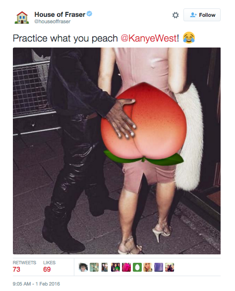 - Emojis can be Misused: The meaning of emojis can change based on popular use, and its important to know what the emoji is and how it is being employed. A great example is the eggplant emoji. Sure, it could mean that you like eggplant… but it is more often used to convey a specific part of human anatomy (I’ll let you figure that one out). Another great example is the peach emoji used above by House of Fraser (Urban Dictionary has a fabulous description).